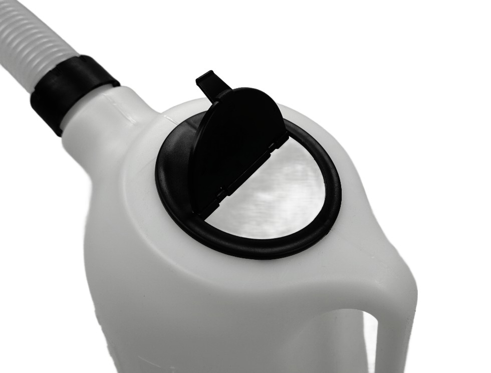 Die Benzinkanne ist ausgestattet mit einem schnell Aufklappbaren Schutzdeckel und einem Dichten Anschluss zum abnehmbaren Flex Auslaufrohr .